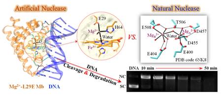 人工核酸酶分子在生物技术和生物医药领域,特别是在基因工程和新型抗菌抗病毒等试剂的发现中具有重要的应用。然而,很少有人工核酸酶分子既能切割又能降解核酸DNA分子。近日,2138CC太阳集团林英武教授课题组在国际催化领域权威杂志《ACS Catalysis》(中科院一区; IF=12.35)发表研究成果——《Rational Design of an Artificial Nuclease by Engineering a Hetero-Dinuclear Center of Mg-Heme in Myoglobin》,同时申请了国家发明专利。