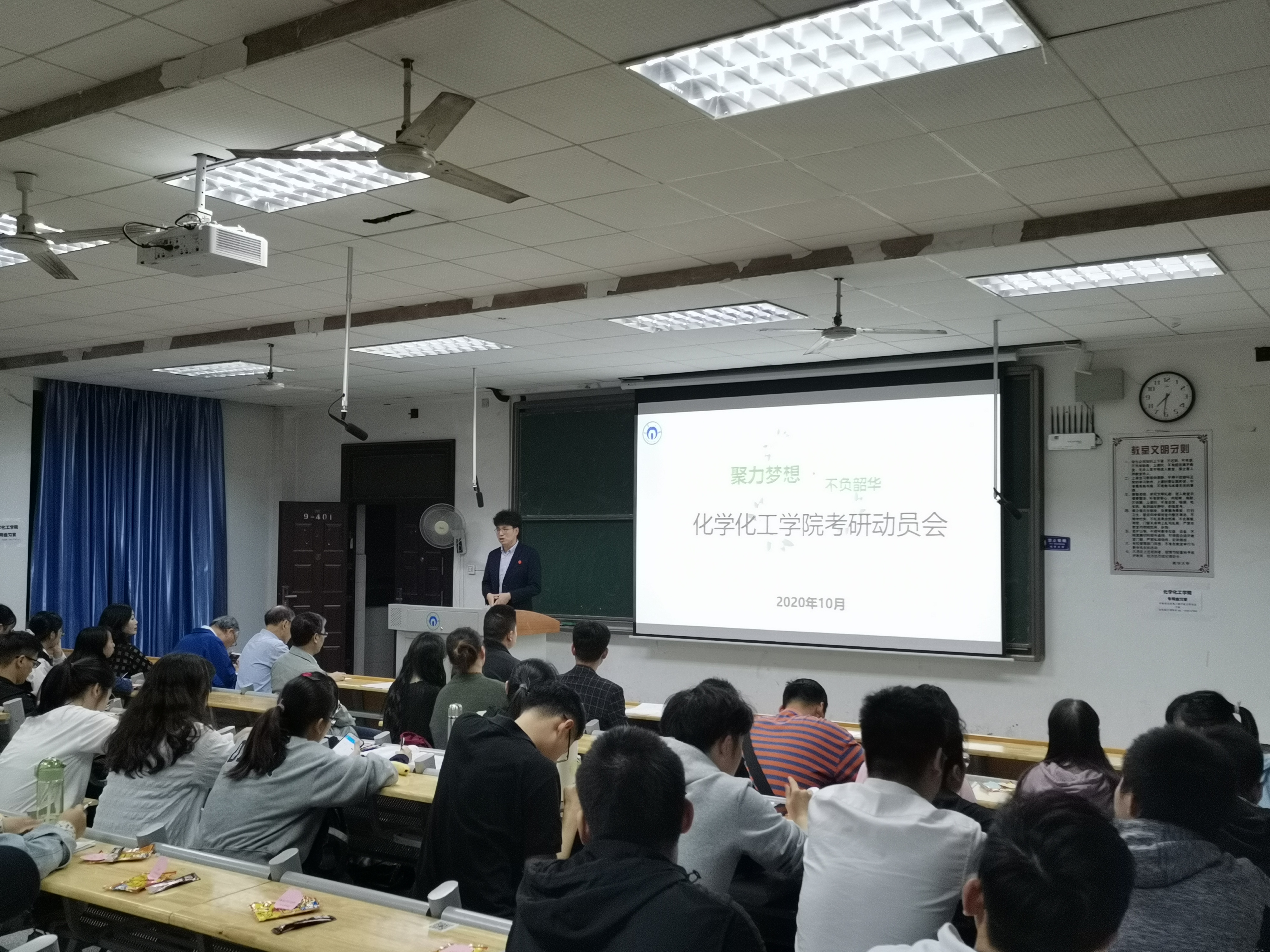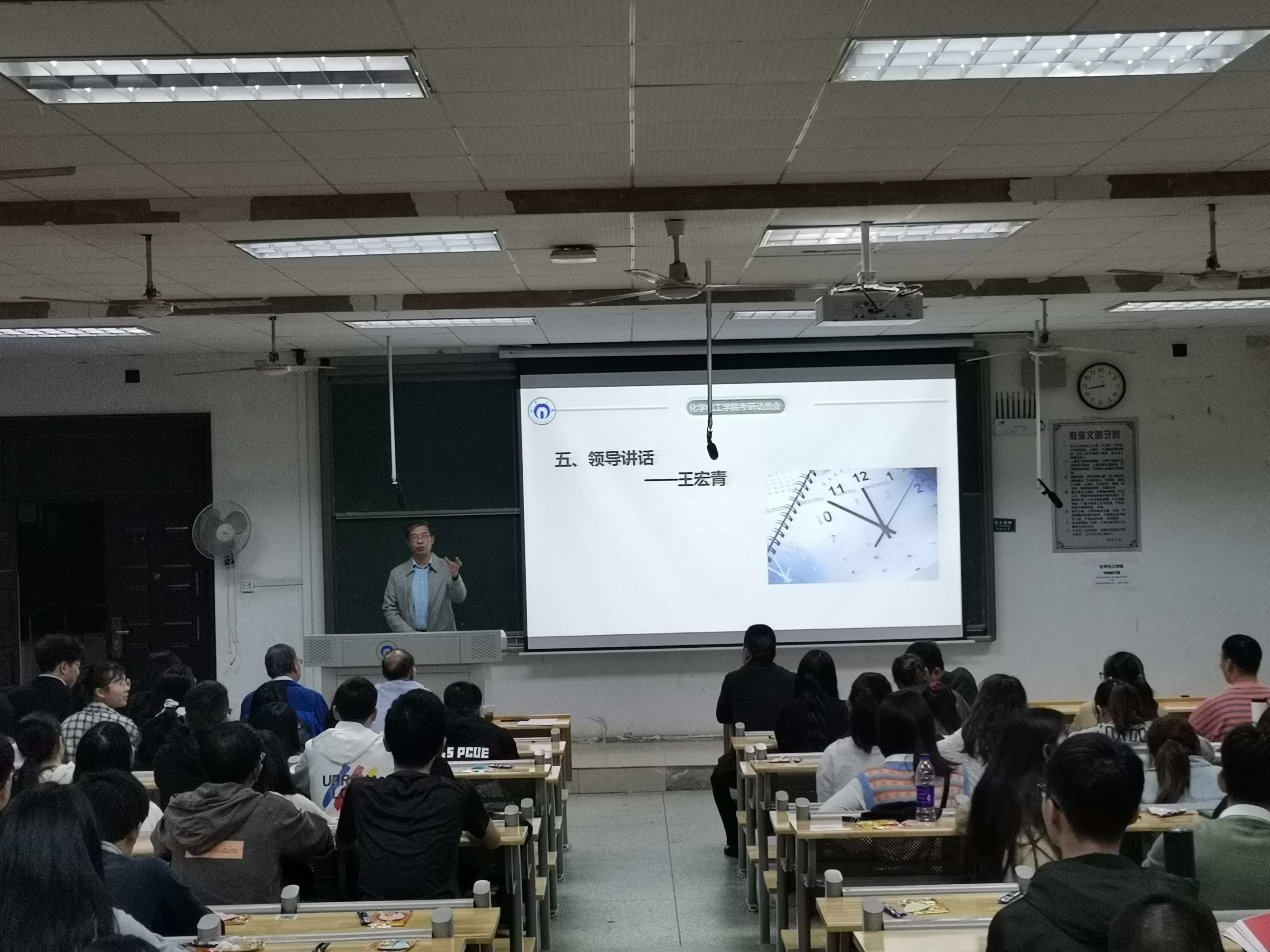 大会伊始,教室播放了2020届毕业生的祝福视频。来自复旦大学、天津大学、西安交通大学等多名学长学姐都纷纷送上各自的祝福。随后,刘霜阳给2021届考研学生在考研冲刺阶段提出了建议。接着,胡清华详细介绍了学院近期的科研发展和学科建设,并以自己的博士之路给同学们做了清晰的考研分析。然后,廖力夫从高校研究生的改革之路给同学们做了分析。充分强调英语作为研究生科研能力的重要性。大会最后,王宏青结合自身担任研究生导师的经历,给同学们详细分析从事科研的五个能力。期望同学在考研过程中实现个人转变,实现考研目标。