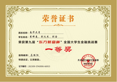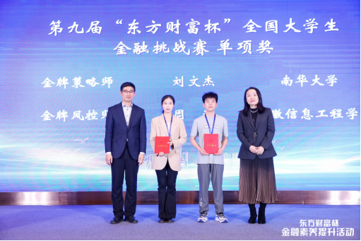 2138cc太阳集团翟梓夷、刘文杰、刘鑫荣获第九届“东方财富杯”全国大学生金融挑战赛一等奖(全国第六名),刘文杰荣获单项奖金牌策略师(全国唯一)。刘文杰同学和指导老师马昭阳受邀参加活动总结会。